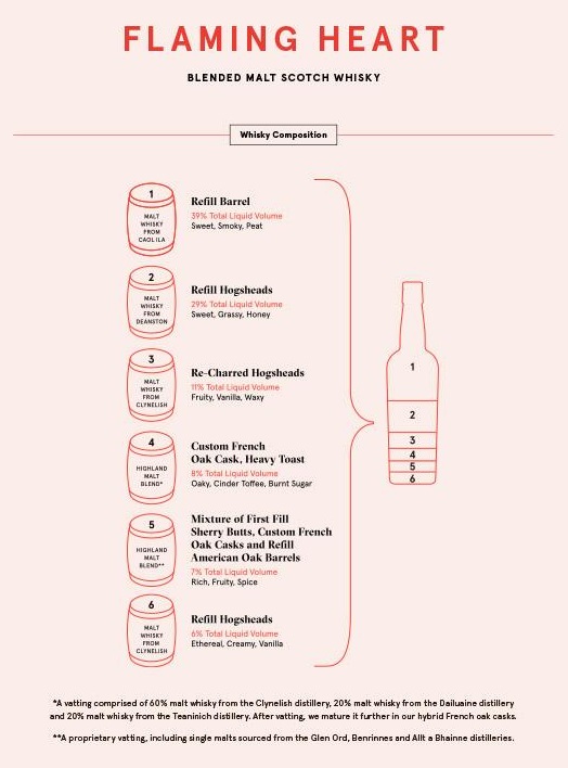 "Bottled at 48.9% / Not chill-filtered / Natural colour / First released in 2006, Flaming Heart was the first whisky to combine the rich, complex spice of Scotch aged in new French oak with the evocative peat-fired smoke of Islay malt. It created a genre-defying style that was smouldering, spicy, complex and so popular that we've re-released it five more times in the years that followed."