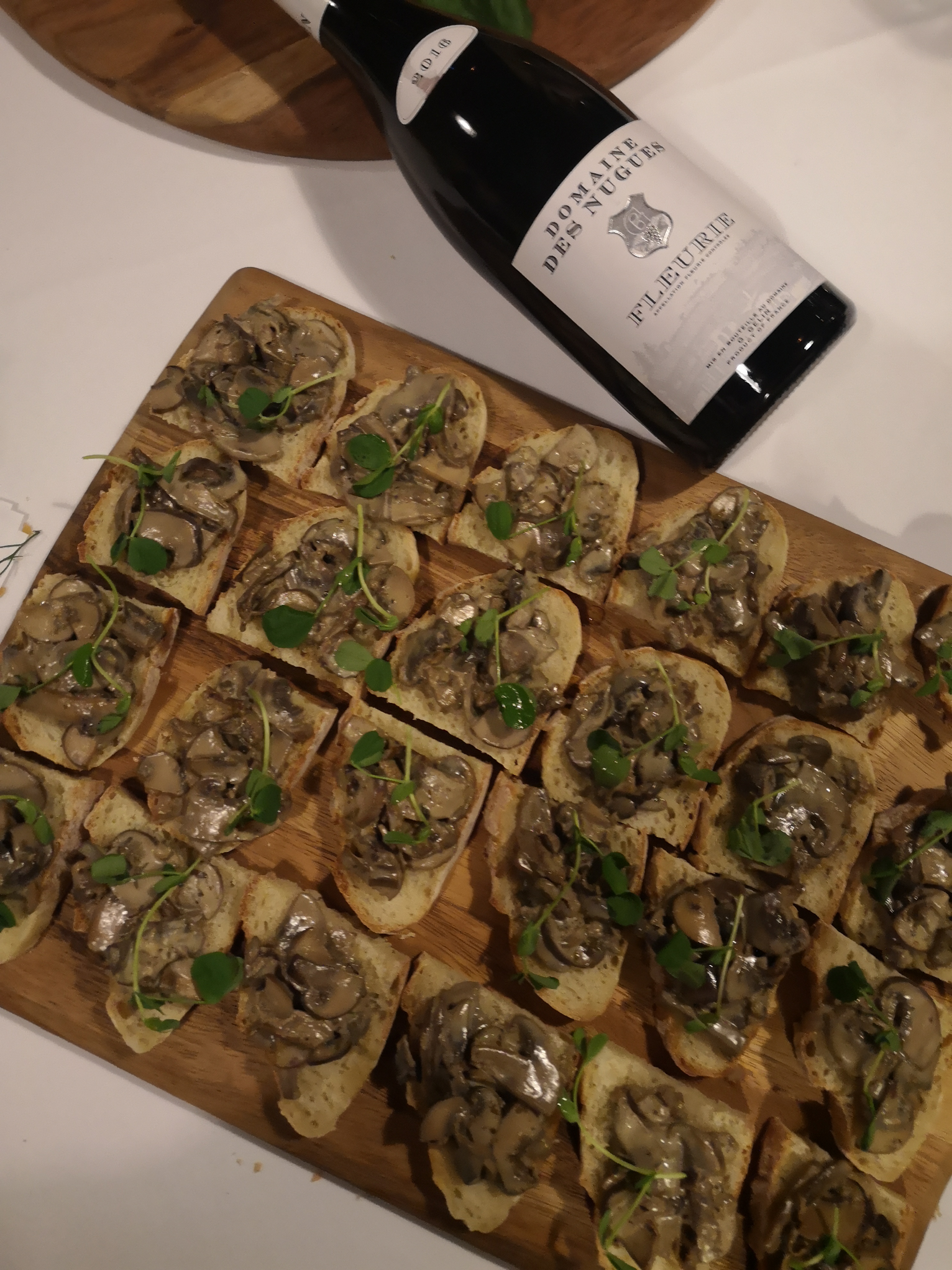 Nugues Fleurie with Mushrooms on ToastGamay Noir + Mushrooms = Heaven. What makes mushrooms better? Putting them on toast. Not a surprise that this was the favourite pairing of the evening!