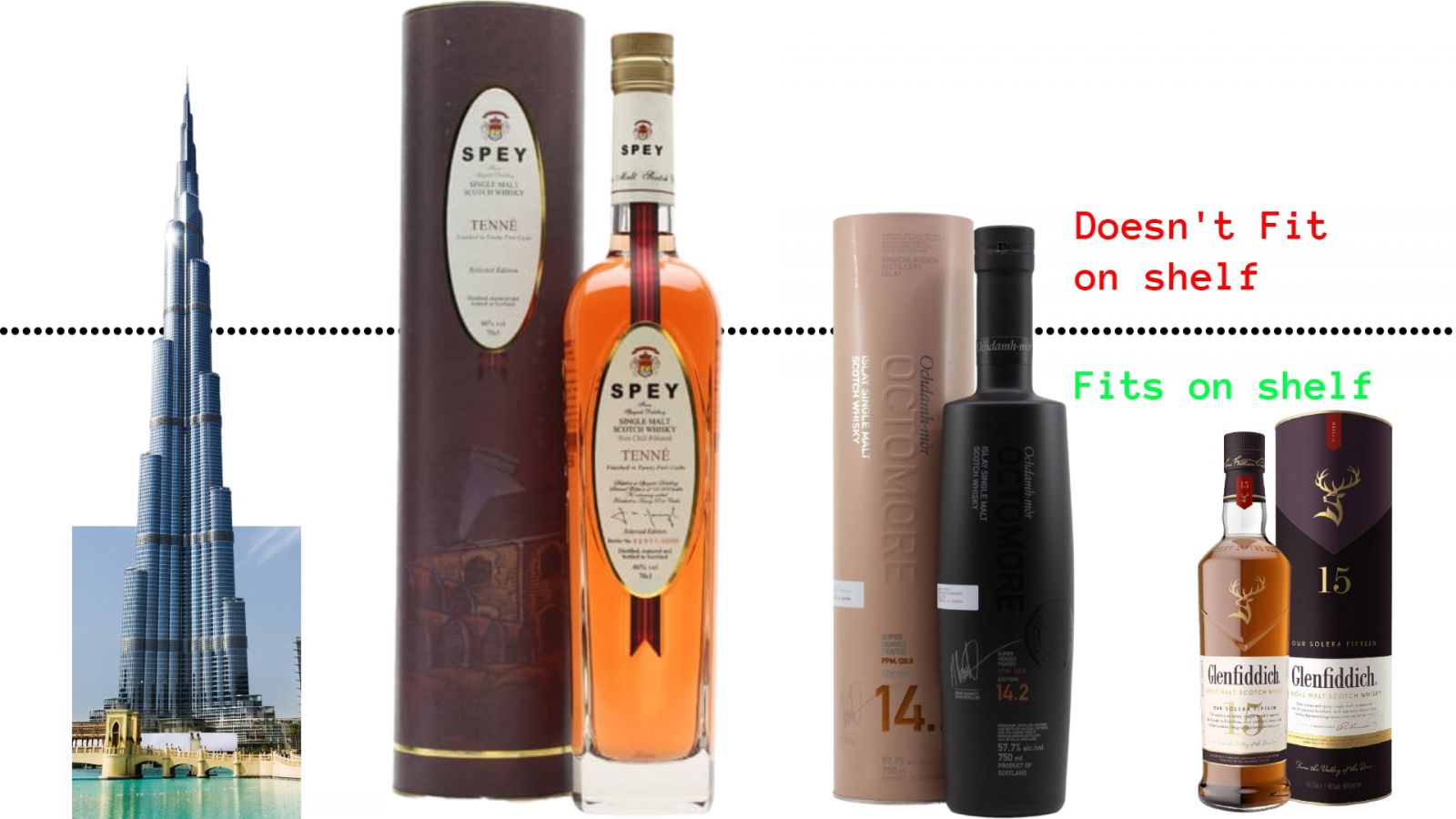 The issue with bottle height - An exact scale model showing the sizing of the Spey Tenne vs bottles of Octomore, Glenffidich and the Burj Khalifa.