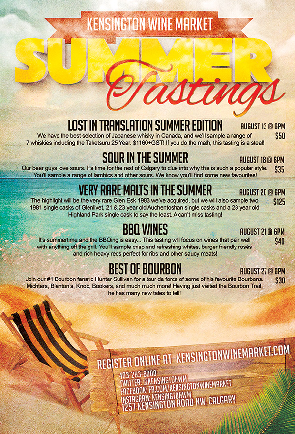 Here are five new tastings to quench your thirst and keep you entertained this summer. All three start at 6PM! Registrations are in store, by phone 403-283-8000 and online!- Lost in Translation Summer Edition - Japanese Whisky including Taketsuru 25 Year! Â - 6PM Thursday August 13 - $50