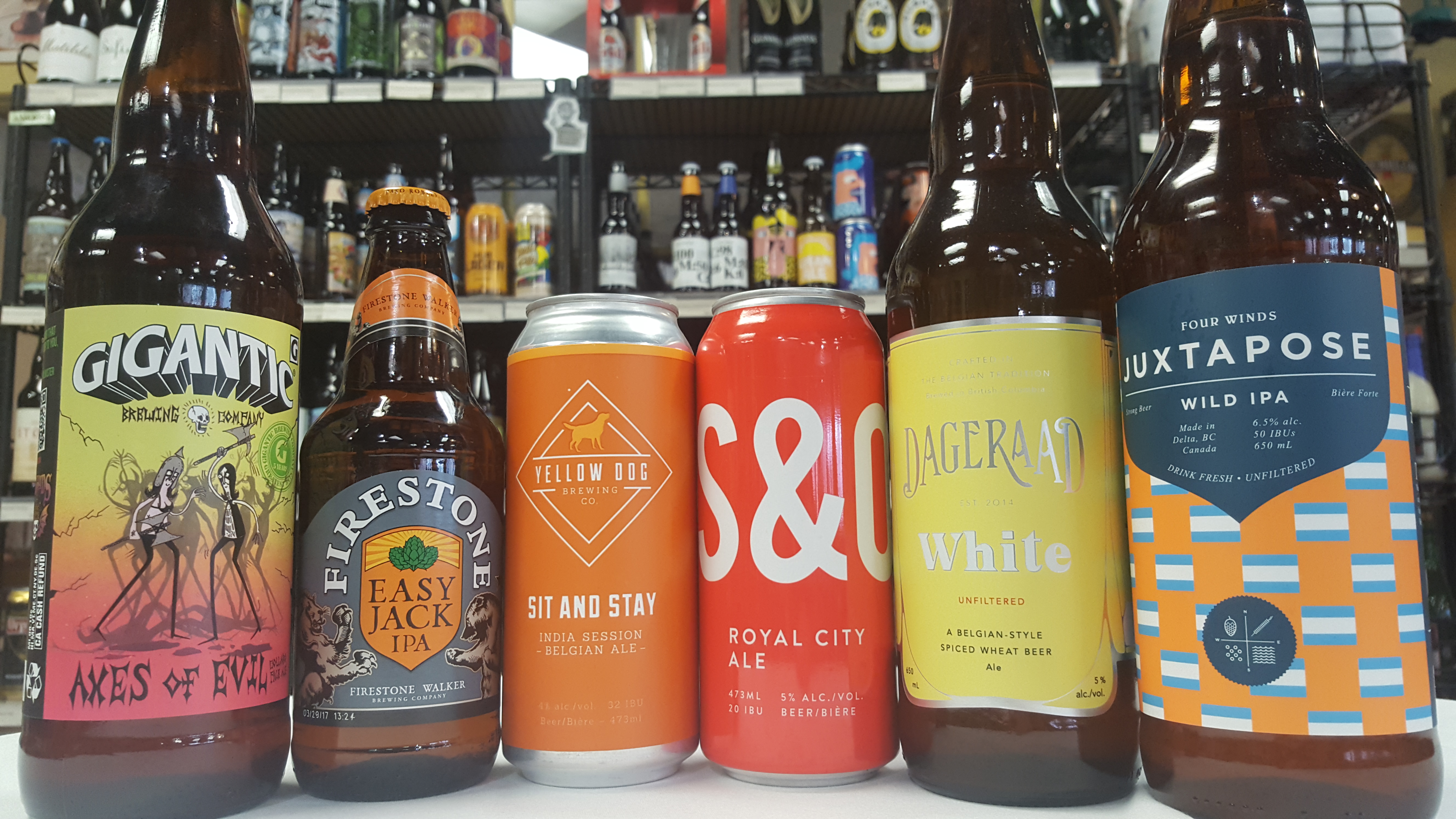Juxtapose Wild IPA by Four Winds: Juxtapose is a modern, North American IPA with a funky twist. Big orchard style and tropical fruity tones with mild funky yeast notes propped up by a pale orange and moderately dry base. Finishes clean with a touch of oily bitterness. ($9.19 for a 650mL bottle)