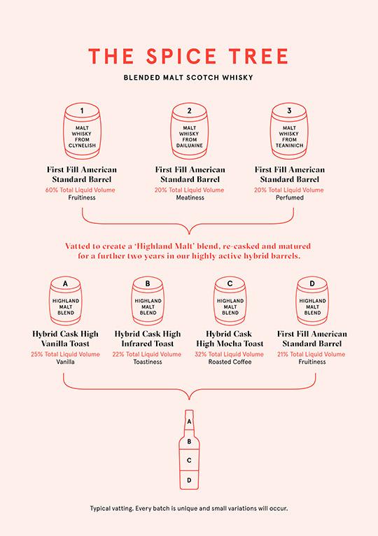 "A long time ago, we created a rich, bold Scotch whisky called The Spice Tree. Unfortunately, due to its avant garde method of oak-aging, we were compelled by the powers that be to discontinue production. Undeterred, we worked with our cooper friends in both France and Scotland to develop a new, hybrid oak cask that would allow us to achieve similar results, but in a way that would be acceptable to even the most conservative of observers. Et voila, THE SPICE TREE was resurrected – matured using a custom-made cask with French oak for the heads and American oak for the bodies. THE SPICE TREE is a rich, intense malt whisky redolent of baking spices and layered with toasty oak accents that complement the underlying distillery character."