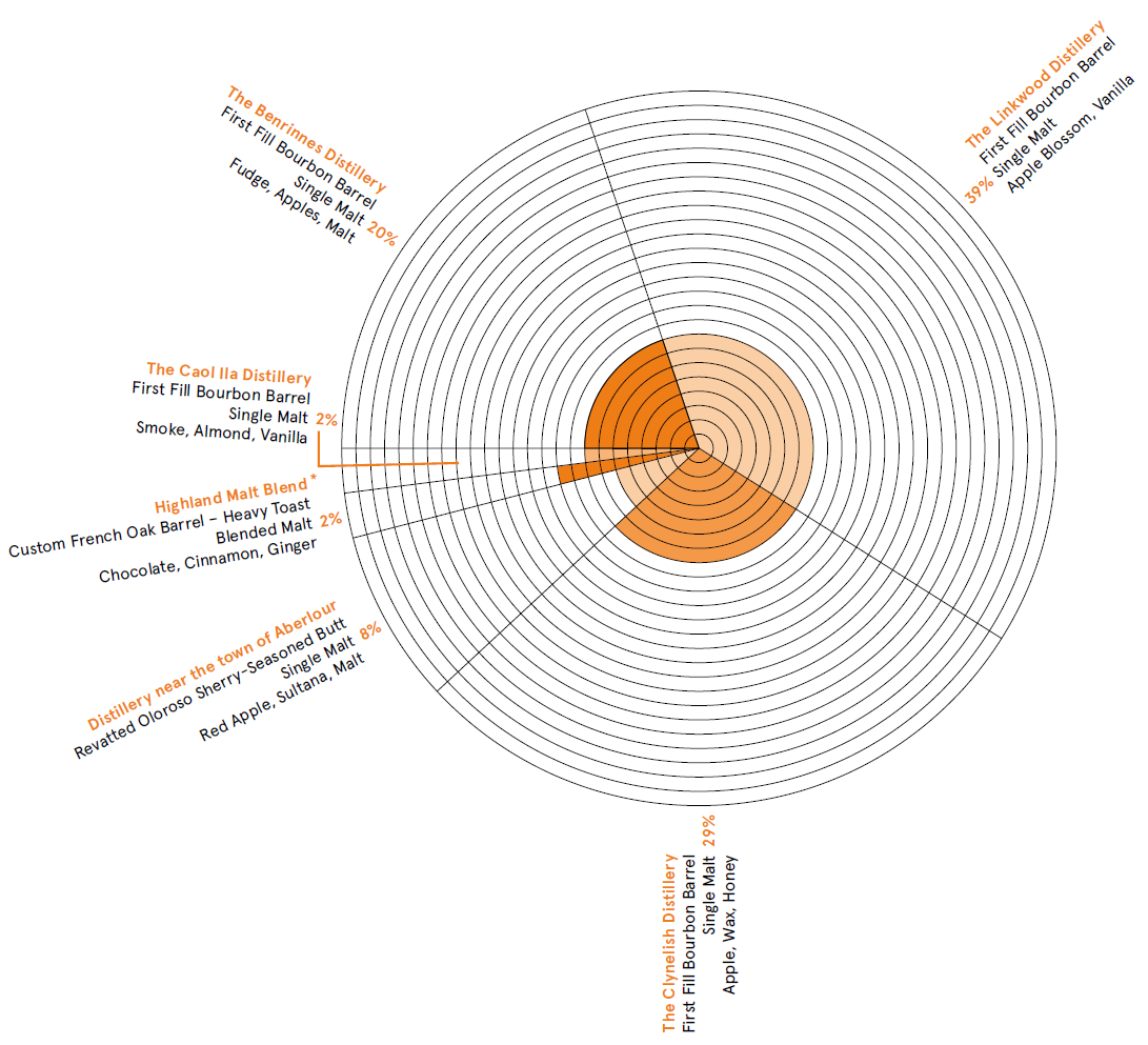 This is a game-changing whisky from Compass Box, built not from acquired aged components, but rather new make spirit acquired and filled into Compass Box own casks. Orchard House is composed of primarily Linkwood (39%), Clynelish (29%), Benrinnes (20%) and Caol Ila (2%), all from First Fill ex-Boubon Barrels, along with Highland Blended Malt (2%) from custom French oak casks and a secret Speyside single malt (8%) from Revatted Oloroso Sherry-Seasoned Butts. Hmmm, a "Distillery near the town of Aberlour" sounds a lot like Benfarclas... 46%.